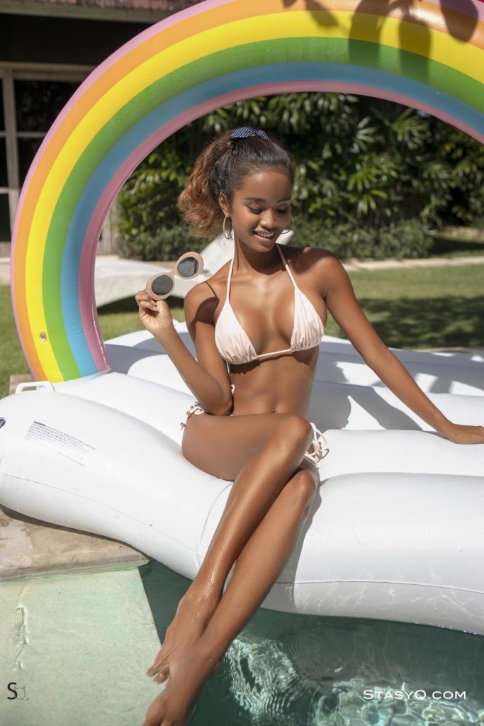 Азиатки Кристи пришла отдохнуть у бассейна. Девушка щедро поливает свои грудки кремом для загара, а потом решает полакомиться мороженым.